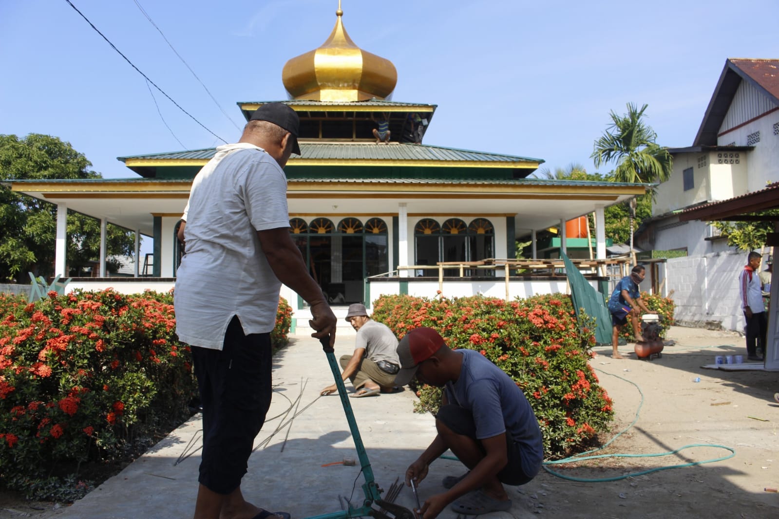 Serma Made, kepada awak medi mengatakan warga yang ikut bergotong royong mendapatkan tanggung jawab untuk memotong besi yang akan digunakan untuk pengikat balok pagar gapura mesjid, dan satu warga lagi meluruskan batangan besi yang akan diukur dan dipotong.