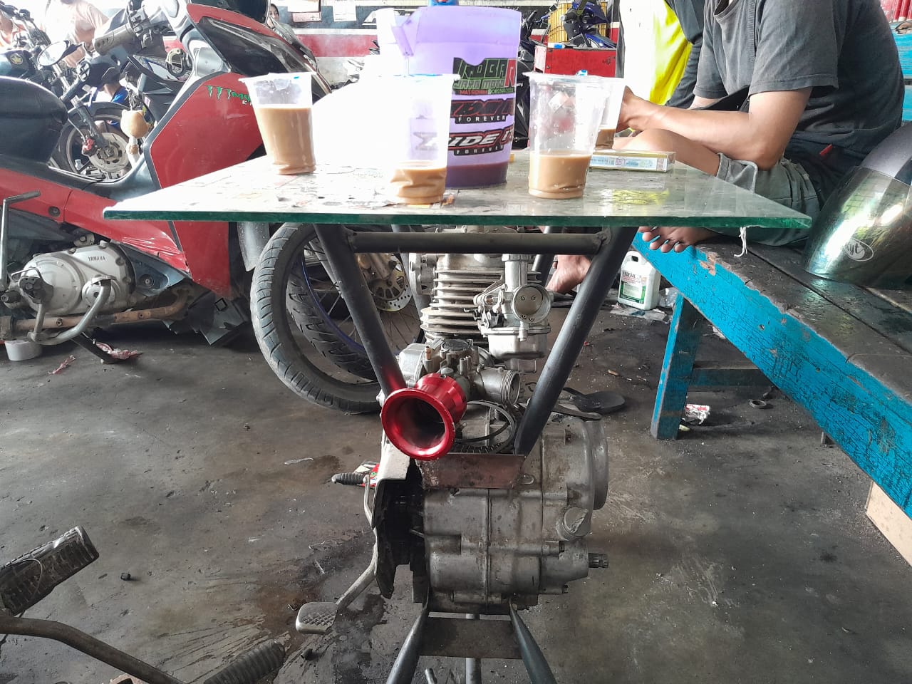 Mesin honda dengan Ring Seher nya kita satukan lalu karburator bekas di rangkai agar kelihat ada mesin di bawah meja, biar unik”Kata Harun Mekanik di bengekel ini