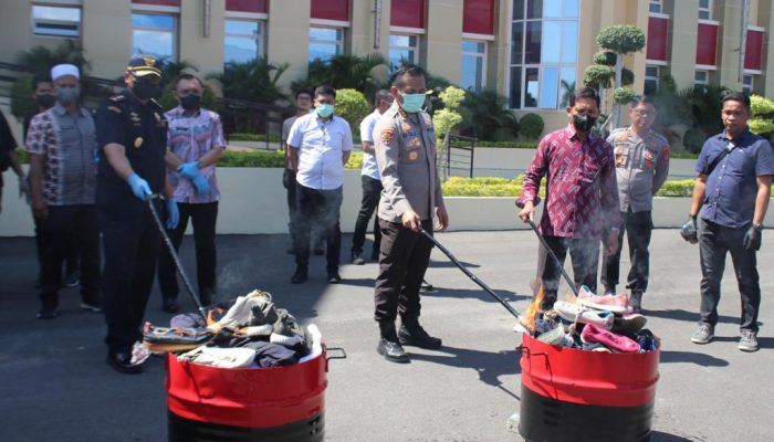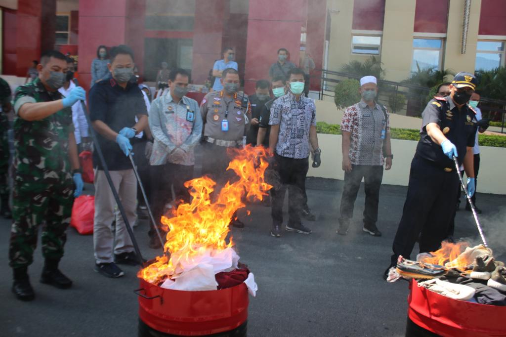 Pemusnahan barang bekas impor dilakukan dengan membakar baik dilakukan secara simbolis maupun dibakar keseluruhan dengan perincian 60 (enam puluh) bal pakaian bekas dan 72 karung sepatu bekas.