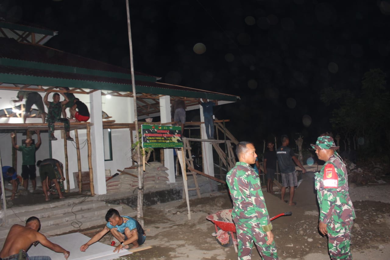 “Sasaran yang akan dikejar pembagunannya adalah di Mushola, jadi kita harus lembur, karena waktu penutupan tinggal 5 hari dimulai dari sekarang, ayo tetap semangat dan tunjukkan bahwa TNI bisa, sambil membawa gorengan buat anggota Satgas makan,”Harapnya.