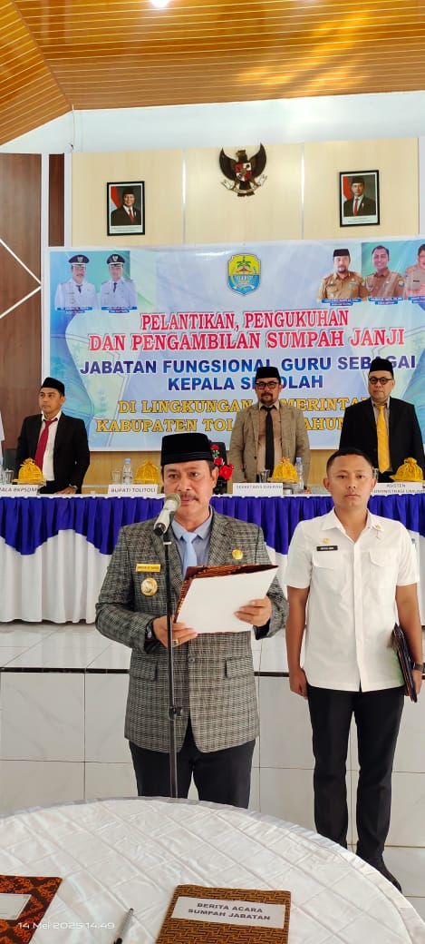 TABENews, TOLITOLI — Bupati Tolitoli H. Amran H. Yahya resmi mengukuhkan sebanyak 97 pejabat fungsional dan kepala sekolah TK, SD, dan SMP di lingkungan Pemerintah Daerah Kabupaten Tolitoli. Pengukuhan tersebut berlangsung di Aula Balre Tau Dako Lipu, Rabu (14/5/2024), dan disaksikan oleh para pejabat serta tamu undangan.