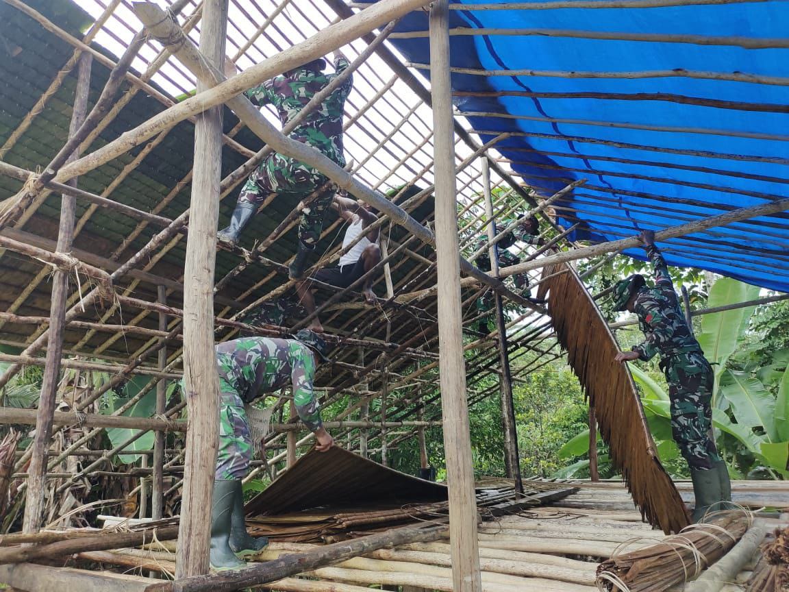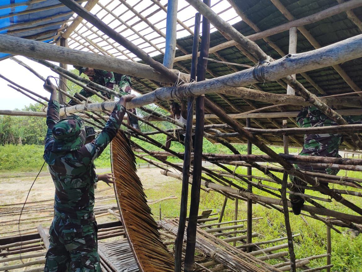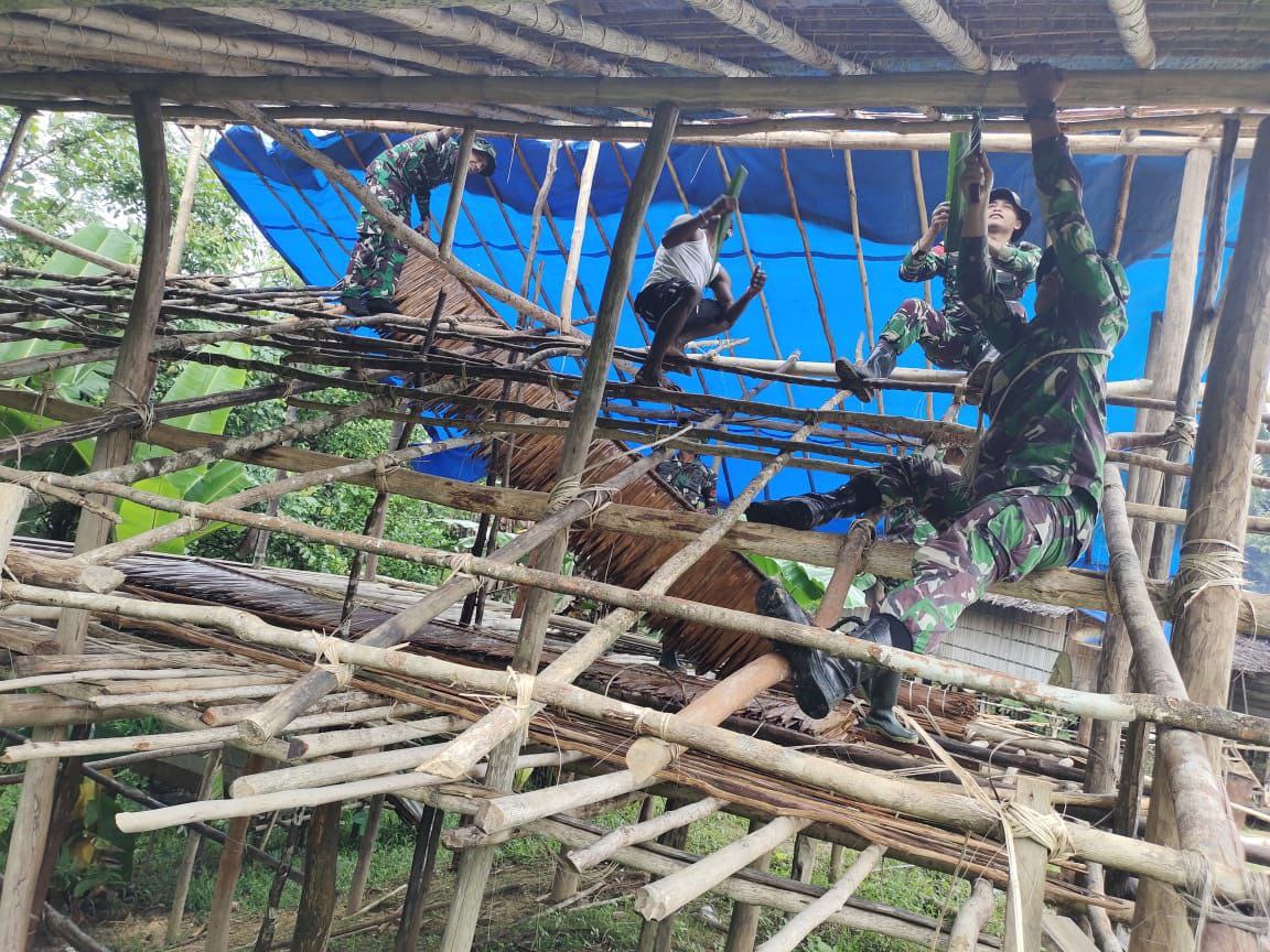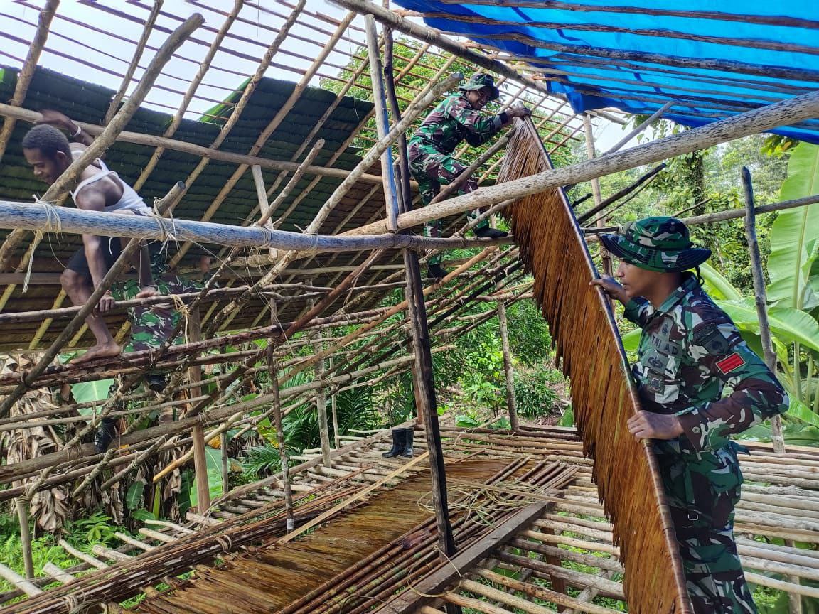 Di Tapal Batas RI-PNG, Satgas Yonif 725/Woroagi Bantu Perbaikan Rumah Warga