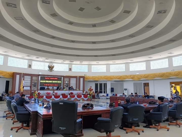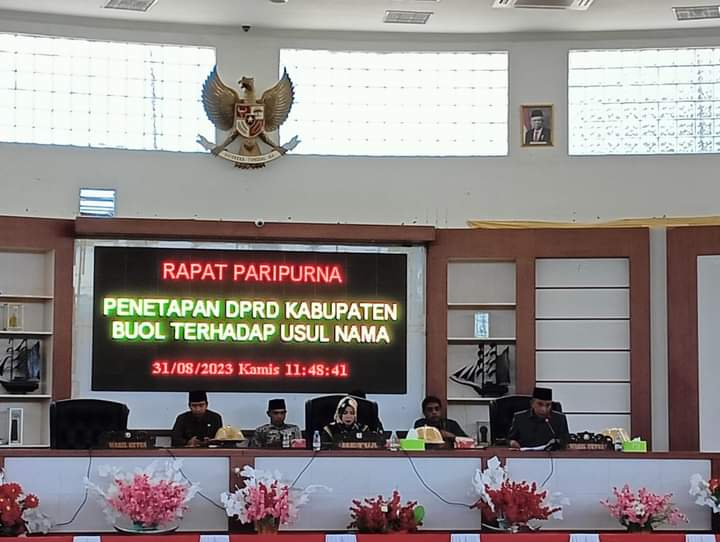 Buol, TABEnews.com – Rapat Paripurna tentang Penetapan DPRD Kabupaten Buol terhadap usul nama calon Penjabat Bupati Buol, dilaksanakan di Ruang Rapat Utama DPRD Kabupaten Buol, Kamis (31/8/2023). Rapat ini dihadiri oleh pimpinan dan anggota DPRD Kabupaten Buol.