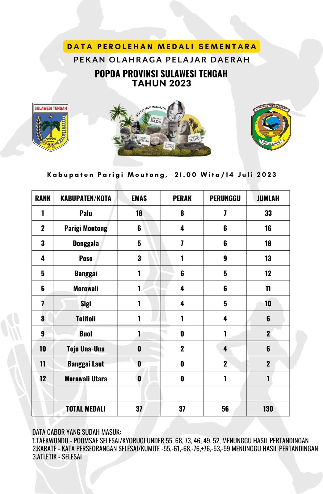 Informasi yang dikumpulkan media pada pelaksanaan Popda Tingkat Provinsi Sulawesi Tengah di Parigi, tim Kota Palu kokoh di urutan pertama di susul tuan rumah Parigi.