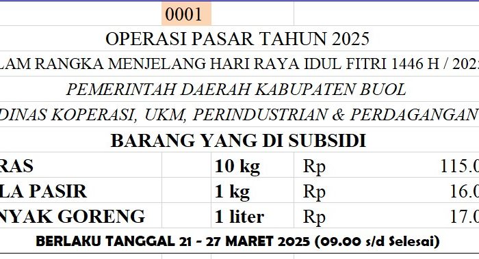 Buol Tabenews.com – Pemerintah Daerah kabupaten buol gelar operasi pasar murah melalui dinas perdagangan kabupaten buol. Jum’at (21/3/25).