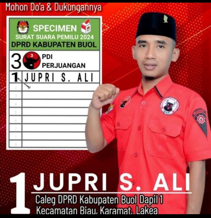 Buol, Tabenews.com – Melalui Partai PDIP jupri S. Ali, mencalonkan diri sebagai calon anggota DPRD Dapil 1 yang meliputi tiga kecamatan yaitu Kecamatan Biau, Kecamatan Karamat dan Kecamatan Lakea di kabupaten Buol dengan no. urut 1.