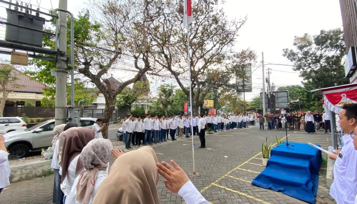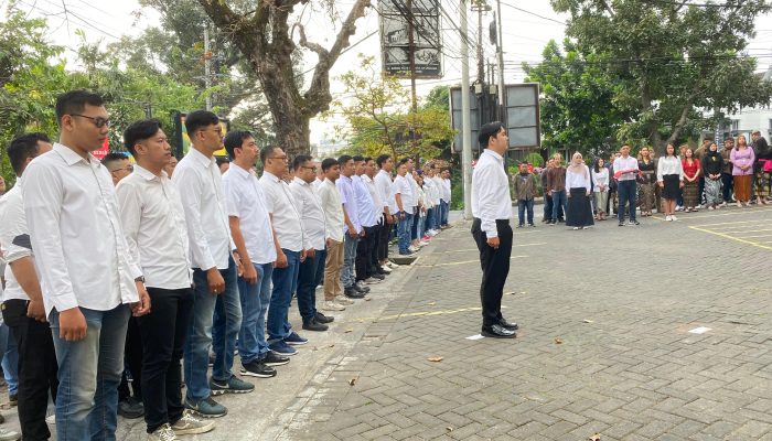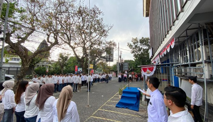 Seluruh peserta upacara, baik karyawan maupun perwakilan dari berbagai divisi, mengikuti rangkaian acara dengan penuh rasa hormat.