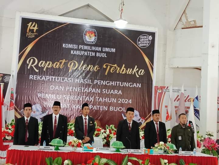 Buol, Tabenews.com – Komisi Pemilihan Umum (KPU) Kabupaten Buol menggelar Rapat Pleno Terbuka Rekapitulasi Perhitungan dan Penetapan Suara Pemilu Serentak Tahun 2024 Tingkat Kabupaten Buol bertempat di Aula KPU Kabupaten Buol, Rabu, (28/2/2024).