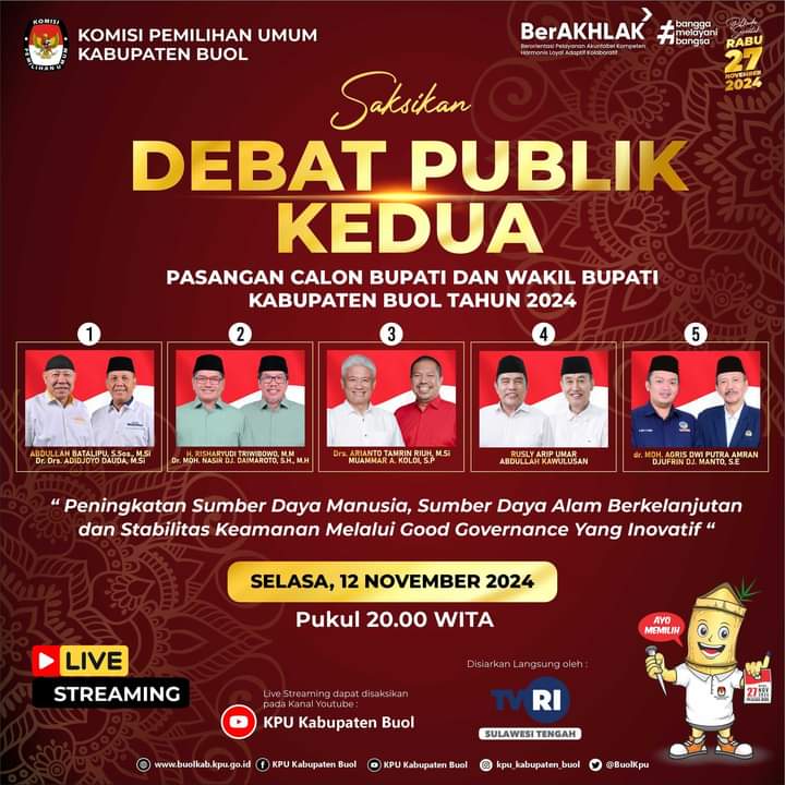 Debat Publik ke Dua bagi Pasangan Calon (Paslon) Bupati dan Wakil Bupati Buol pada putaran Pemilihan Kepala Daerah (PILKADA) serentak 2024.