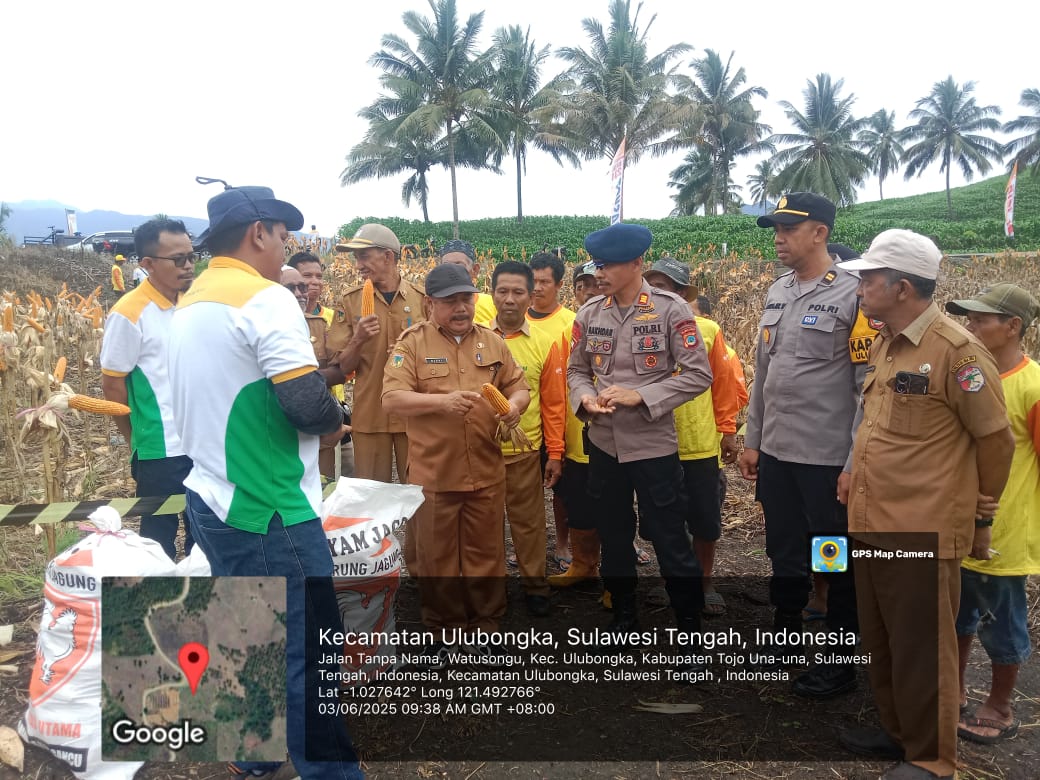 Kapolsek Ulubongka, Iptu Muhajir Wonti, hadir memberikan dukungan penuh, menyatakan hasil panen sangat memuaskan dan bermanfaat bagi petani setempat.