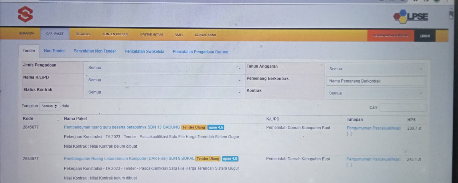Buol, Tabenews.com – Seperti diketahui, baru-baru ini telah diumumkan tender pelelangan proyek beberapa kegiatan di situs lpse.buol.go.id.