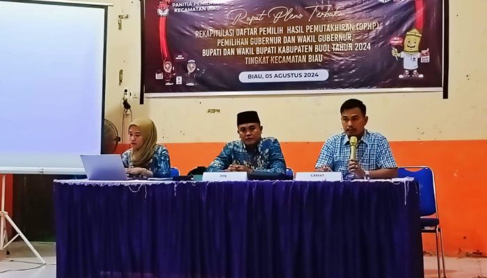 Hal tersebut juga dilakukan oleh PPK Biau yang menggelar Rapat Pleno Terbuka Rekapitulasi DPHP, Pada pemilihan Gubernur dan Wakil Gubernur Sulteng, Bupati dan Wakil Bupati Buol, tahun 2024, yang bertempat di Aula Kantor Kecamatan Biau, Kabupaten Buol, Banten, Selasa, (05/08/2024), yang di buka langsung oleh camat biau.
