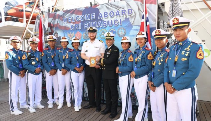 Satuan Latihan Kartika Jala Krida tahun 2023 Taruna AAL Tingkat III Angkatan ke-70 dibawah pimpinan Palaklat KJK 2023 Mayor laut (P) Rendra Hariwibowo melaksanakan pertemuan dengan Commanding Officer for The Norwegian Coast Guard Vessel KV Nornen, Lieutenant Commander Oystein Johansen, di KRI Bima Suci saat sandar di pelabuhan Fredrikstad, Norwegia, Selasa, (18/7).