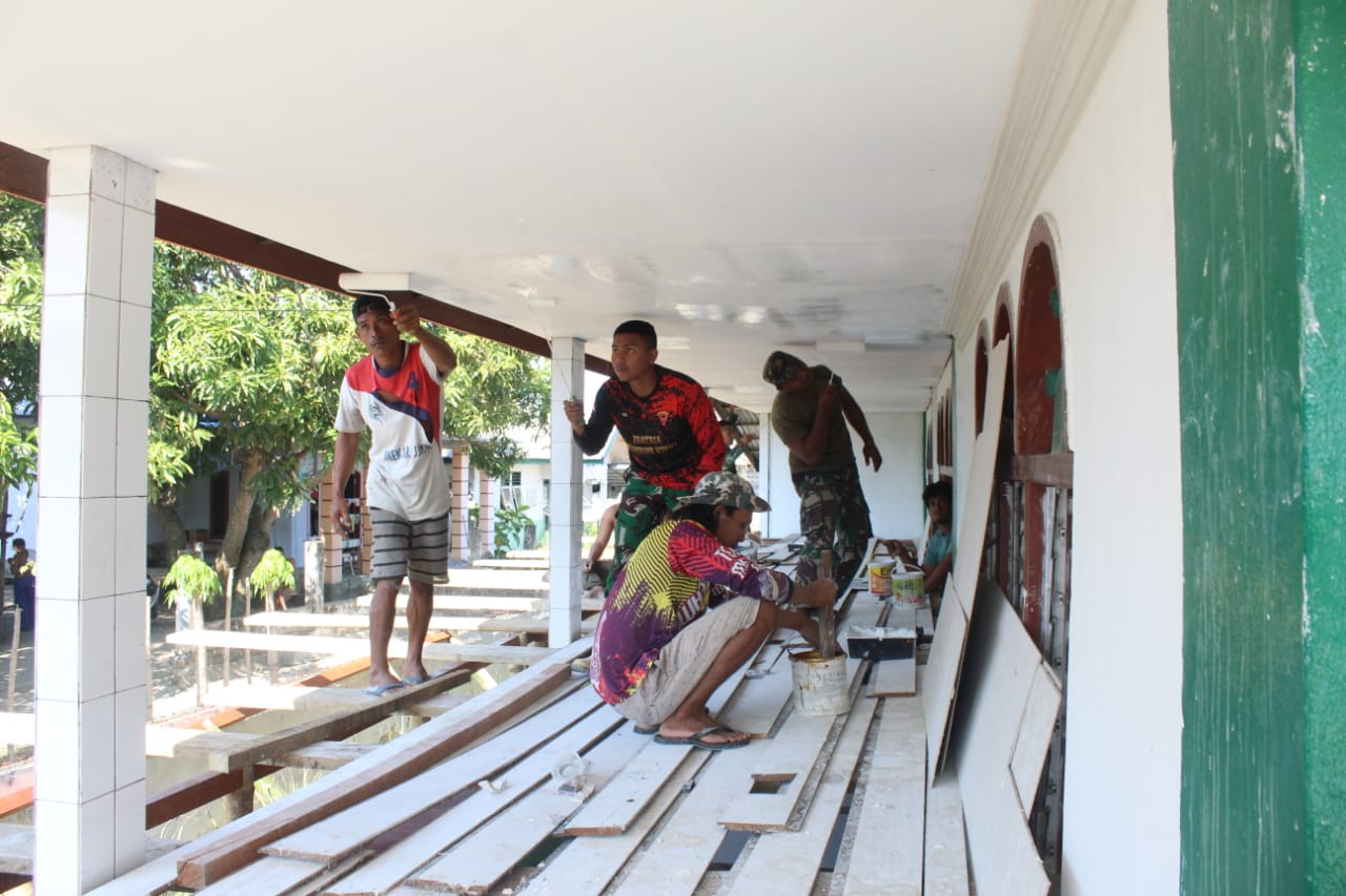 Tolitoli, Sulteng – Serma Made anggota Satgas TMMD Ke-118 Kodim 1305/BT dan Warga masih terlihat semangat melaksanakan pengecatan triplek plafon diluar mesjid diwilayah rehab Masjid Nurul Iman, Sabtu (07/10/2023).