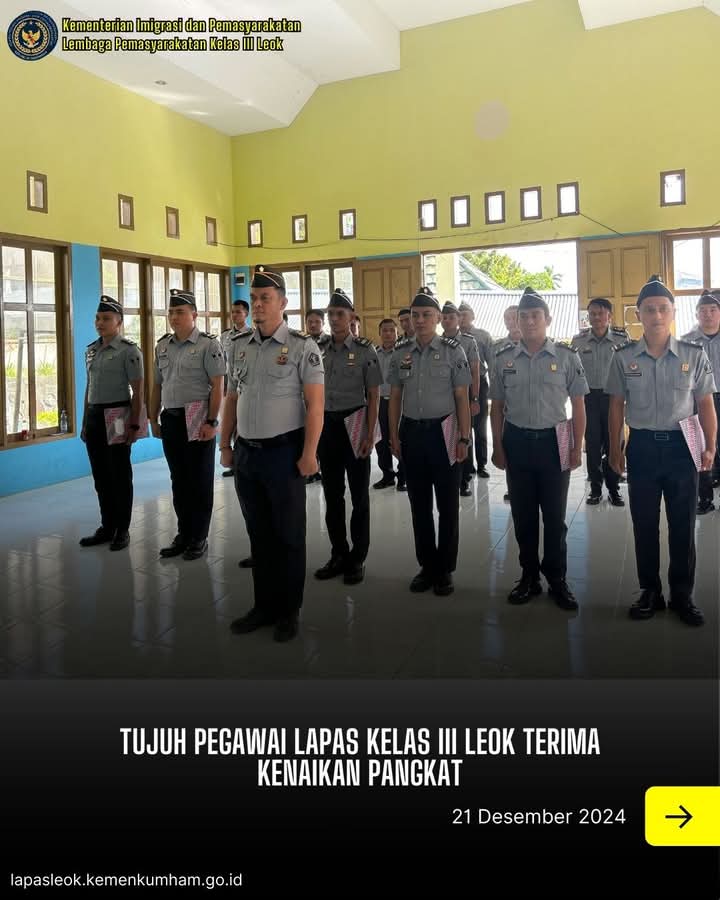 Kegiatan ini bertujuan untuk memberikan apresiasi dan motivasi kepada pegawai yang telah berhasil mendapatkan kenaikan pangkat sesuai dengan ketentuan yang berlaku. Upacara tersebut dipimpin langsung oleh Kepala Lapas Kelas III Leok, Galih Setiyo Nugroho, A.Md.IP., S.H., yang menyampaikan pesan kepada para pegawai yang naik pangkat untuk terus meningkatkan profesionalisme, kinerja, dan dedikasi dalam melaksanakan tugas.
