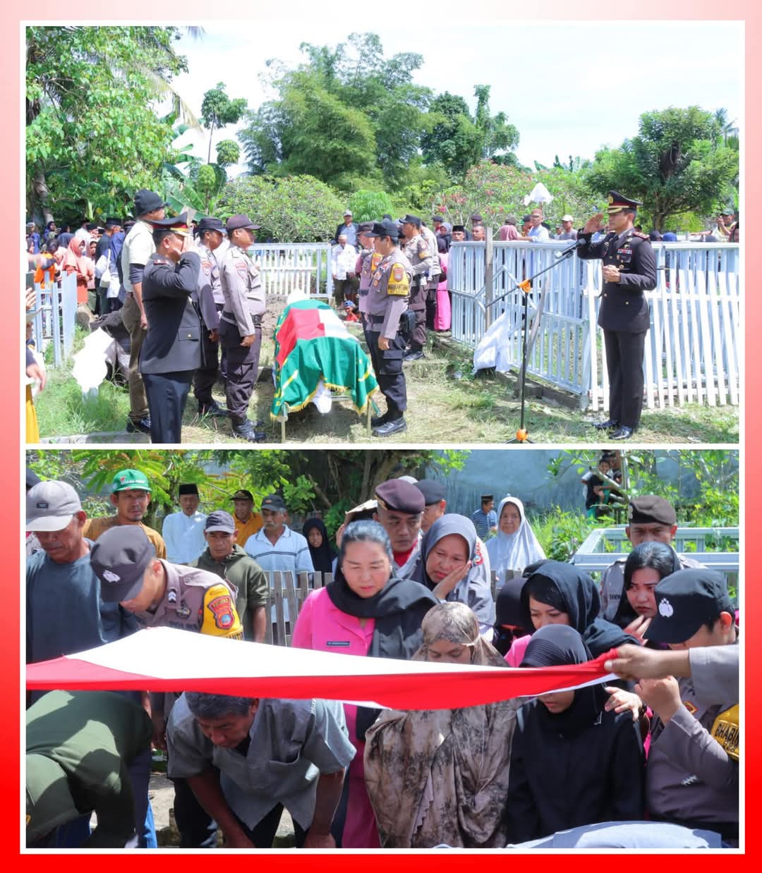 Kapolres Tolitoli, AKBP Wayan Wayracana Aryawan, S.I.K., memimpin upacara sebagai bentuk penghormatan terakhir kepada almarhum yang meninggal dunia pada Senin malam, 27 Januari 2025, di Puskesmas Desa Laulalang. Dengan pengibaran bendera setengah tiang, prosesi ini berlangsung khidmat, mencerminkan rasa kehilangan yang mendalam.